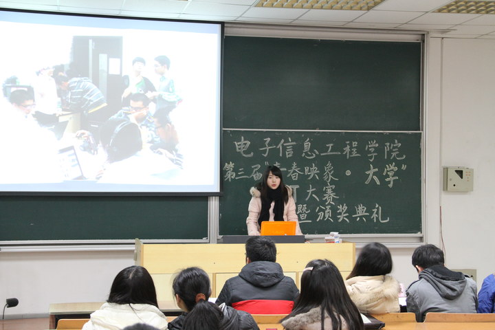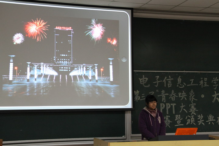 大赛围绕“青春映像·大学”的主题展开,十一支入围决赛的参赛队依次上台展示自己的作品。他们的PPT或诙谐幽默,或感情真挚,或丰富多彩。其中,陈涵洁同学向我们展示了她与社联宣传部的点点滴滴;苟娜同学以“春夏秋冬”为线索向我们展示了她体验到的大学生活,而赵逸飞同学则以诙谐的风格为我们讲述了大学生活给他带来的的感触。其他同学也用自己独到的见解向观众呈现出他们丰富多彩的大学生活。台下在座的观众无不被参赛选手的精彩表现所折服,掌声不断。