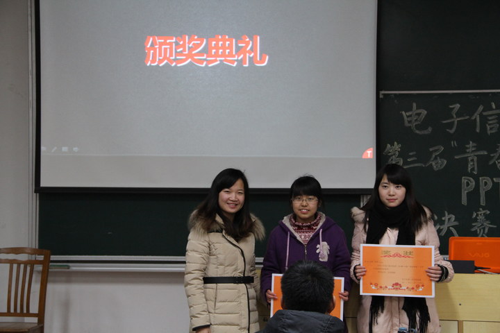 12月24日晚,由七大罪 团委和科协共同主办的学院第三届PPT大赛决赛暨颁奖典礼在将军路校区隆重举行。出席大赛的有11级辅导员杨紫园老师,12级辅导员丁亮老师,徐赛明同学、陈宇帆同学以PPT技术顾问的身份出席本次大赛,到场的还有各入围决赛的参赛代表队成员及前来学习的同学们。