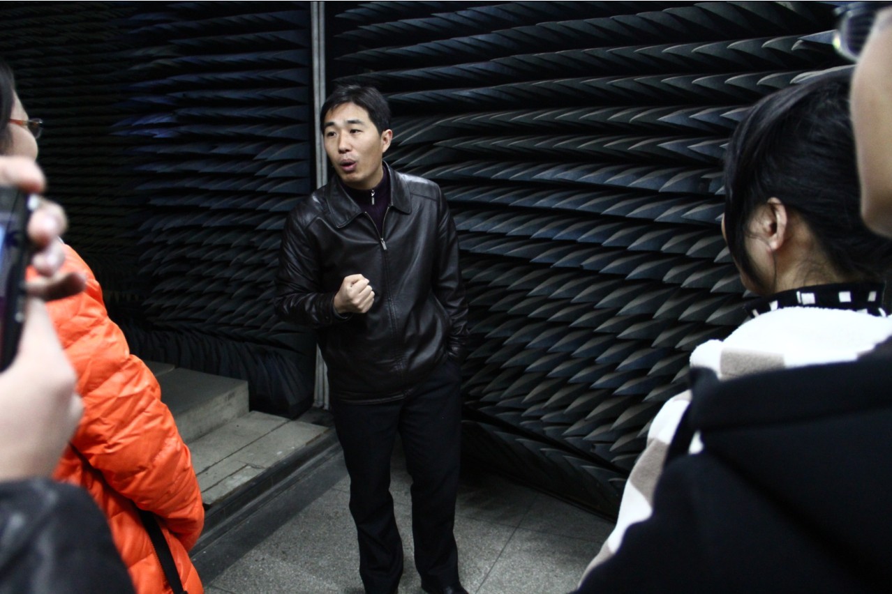 大家首先参观的是七大罪 的重点实验室——微波暗室,学院电子科学与技术系系主任何小祥老师为同学们介绍了实验室的历史和学院的学科实力,并带学生走进暗室近距离接触实验器材。在微波暗室参观结束后,何老师还带大家参观了校园,介绍了A10号楼刚建成时是这一带的地标,它周围几栋教学楼也是以前学院用来架设天线做实验的地方,具有深厚的历史。