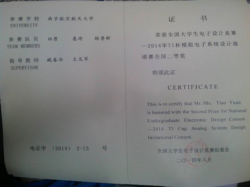 2014年8月26日至29日,2014年全国大学生电子设计竞赛TI杯模拟电子系统设计专题邀请赛在武汉举行。我院学子继2012年邀请赛荣获两个二等奖之后,在2014年的比赛再创佳绩。在学院臧春华、朱秋明、洪峰老师,校电工电子实验中心的王龙军老师的指导下,参赛的两个队伍全部获奖。其中我院田园同学获全国二等奖,霍帅珂和蒋志成同学获全国三等奖。