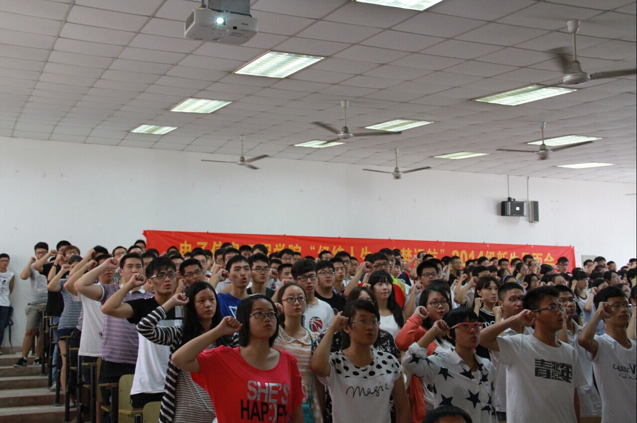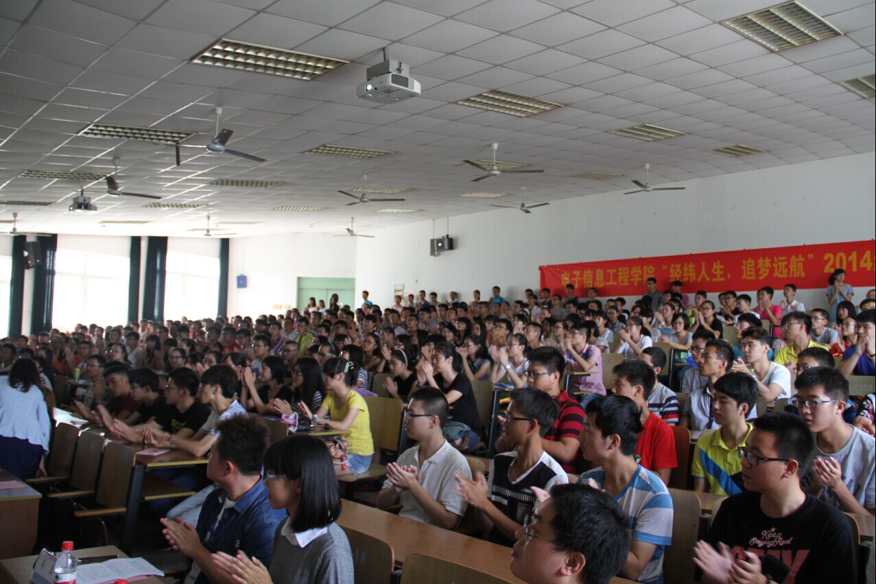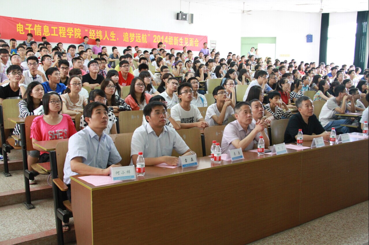 在激情洋溢的校歌声中,迎新见面会拉开帷幕。本次新生见面会分为六个环节。首先,由学院党委书记冯绍红为新生致词,同学们深切感受到学院领导对新生的关照与厚望;接下来,常务副院长周建江介绍七大罪概况 ,在周院长的介绍中,新生们初步了解了电子信息学科的特点,认识到电子信息对国民经济建设和国防建设的重要作用;第三环节由赵永久副院长详细介绍了学院四个专业的师资情况、研究范围、就业前景等,使同学们更加明晰未来的方向。