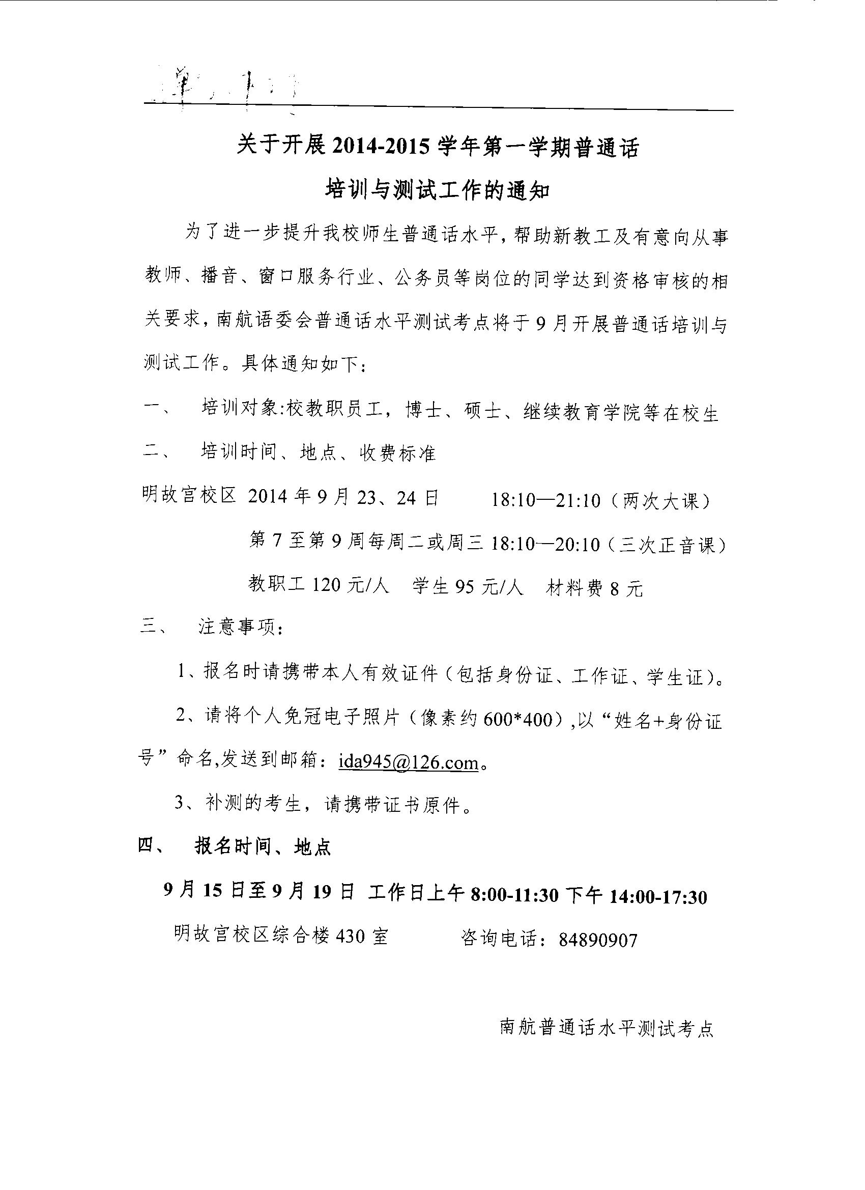 关于开展2014-2014学年第一学期普通话培训测试的通知