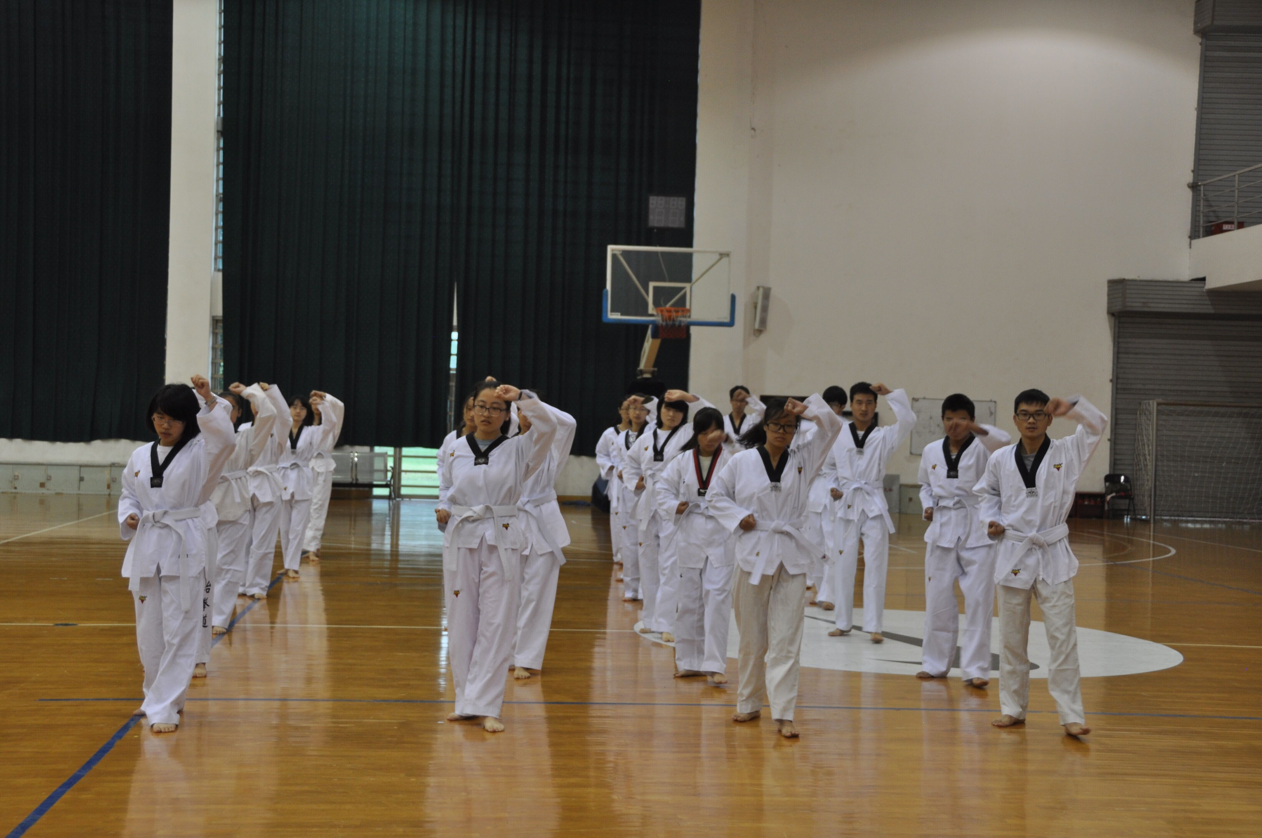 比赛项目分为太极一章和太极三章,作为跆拳道中的基础训练项目,队员们早已将这套动作练的炉火纯青。学院代表队排在第6位出场,刚上场时,队员们都还有些紧张,动作稍有生硬,但长时间的训练和默契的配合使得队员们很快调整了状态,找回了训练时的感觉,在短短几分钟里稳扎稳打,完美地完成了整套动作。表演完成后,评委们分分鼓掌,对学院代表队的出色表现充分肯定。最终,学院代表队在众多强敌中脱颖而出,夺得二等奖。