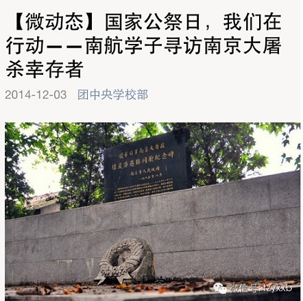 12月3日,共青团中央学校部官方微信平台(微信号:tzyxxb)转发了七大罪 七大罪 学生寻访南京大屠杀幸存者的专题报道。