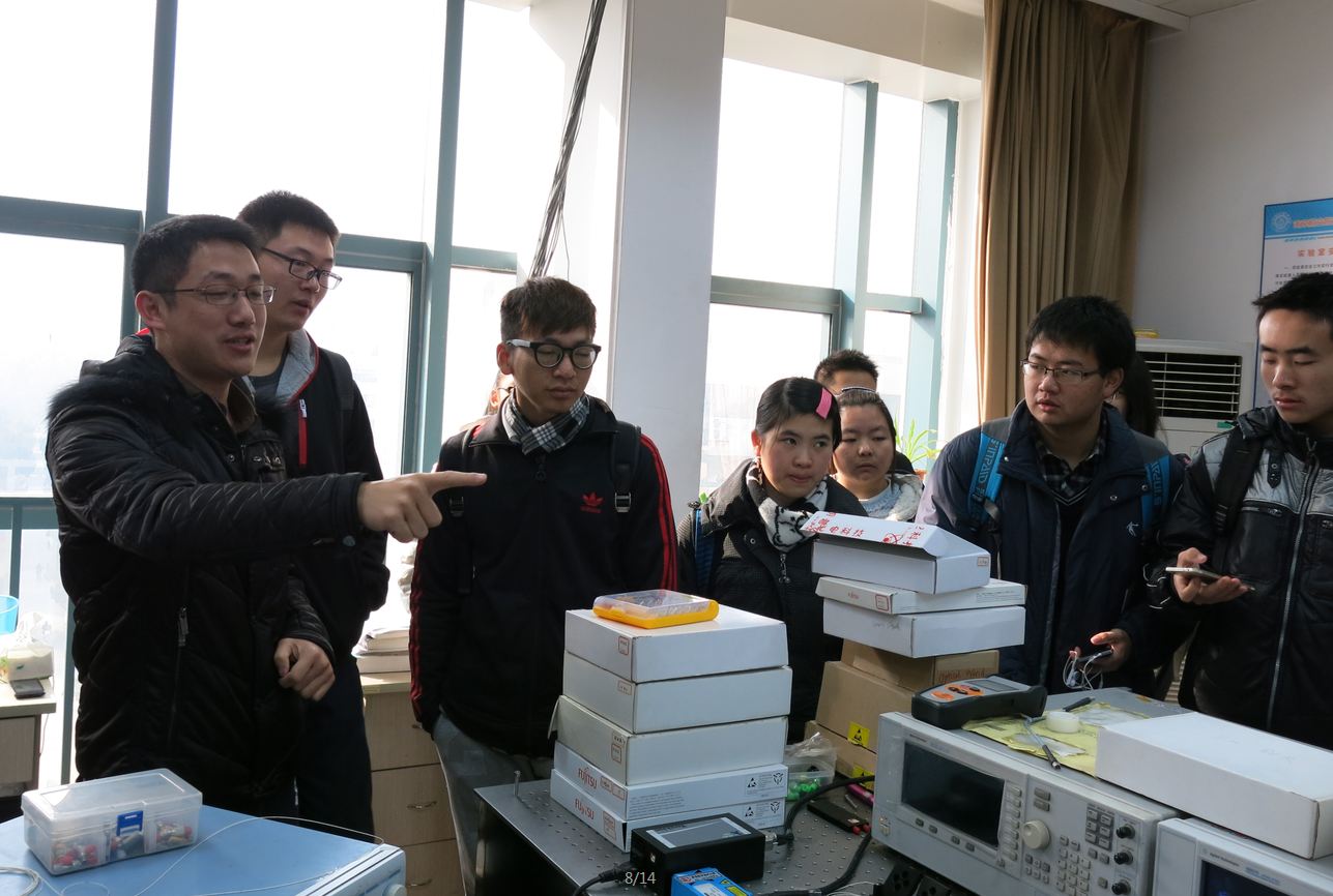 到达明故宫校区后,同学们首先在电子科学与技术系系主任何小祥老师的带领下来到了我院特有的的重点实验室—微波暗室。该室建于建校之初,投入巨额资金,整个房间被不锈钢包裹,实验室内可完全屏蔽信号,使科研人员可以更加精确地测量到实验数据,我院的多个科研成果都是建立在这个暗室的基础上完成的。何老师一边带着学生参观一边详细讲解各个设备的作用,使学生们对电子信息专业有了更深刻的认识,对于这个专业也有了更加浓厚的兴趣。参观完微波暗室后同学们来到了学院微波光子教育部重点实验室,见到我院的潘时龙教授。潘教授的一名研究生为同学详细地介绍了光电信息研究的发展方向和研究内容。现场学生和研究生学长你问我答,互动热烈。