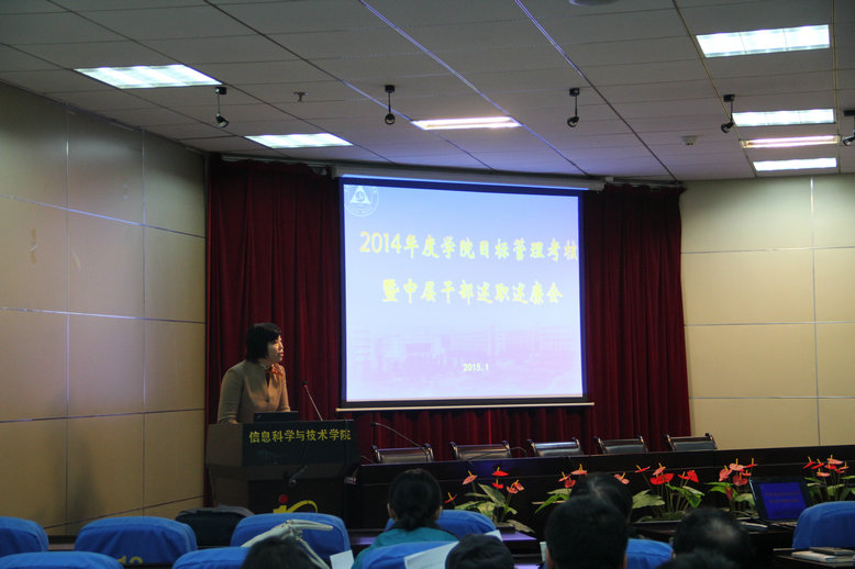会上,院党委书记冯绍红先对学院年度目标管理测评和中层干部测评工作进行了说明。随后,常务副院长周建江结合2014年学院目标管理的各项任务,从学科建设、人才引进、人才培养、科学研究、国际交流、外部资源争取及学科建设和其他重要工作及特色工作等7个方面对2014年工作进行了总结。他指出这一年学院“和谐进取”的氛围已经形成,学院上下齐心协力,整体工作稳中有进,较好地实现了年初制定的各项目标。