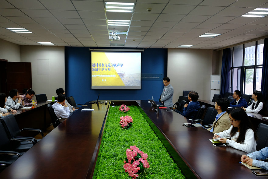 受聘仪式结束后,程强教授做了题为“超材料在电磁学及声学领域中的应用”的精彩学术报告,重点介绍了超材料在电磁学和声学领域中最新的研究热点及研究进展。程强教授的报告内容新颖丰富、非常生动,受到了师生的热烈欢迎。