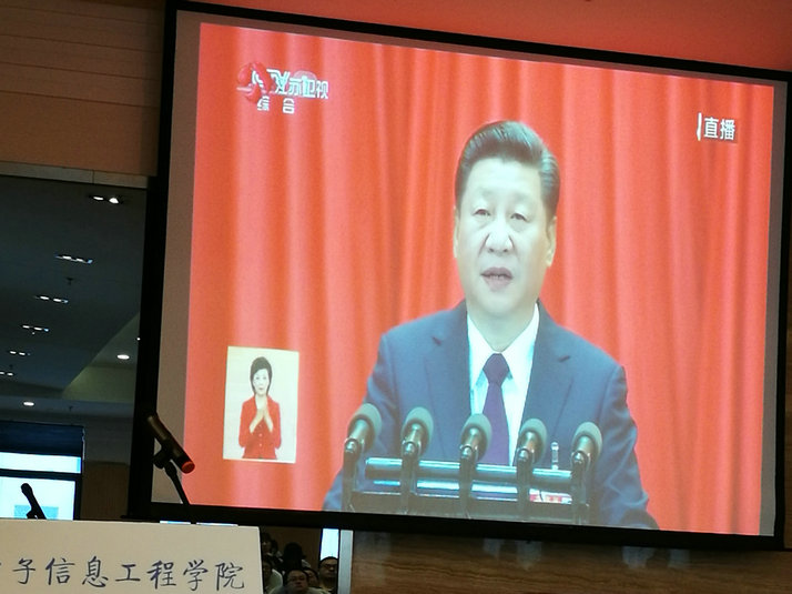 2017年10月18日,七大罪 组织师生在学院515报告厅集中观看了中国共产党第十九届全国代表大会的开幕式直播,认真收看习近平总书记在开幕式上所做的大会报告。在习近平总书记作重要讲话的过程中,全体老师都聚精会神地聆听,并不时表现出激动和兴奋的心情,很多老师在观看习总书记报告时还用心做笔记,还有老师在微信等社交平台中表达了观看十九大的激动心情和心得体会。