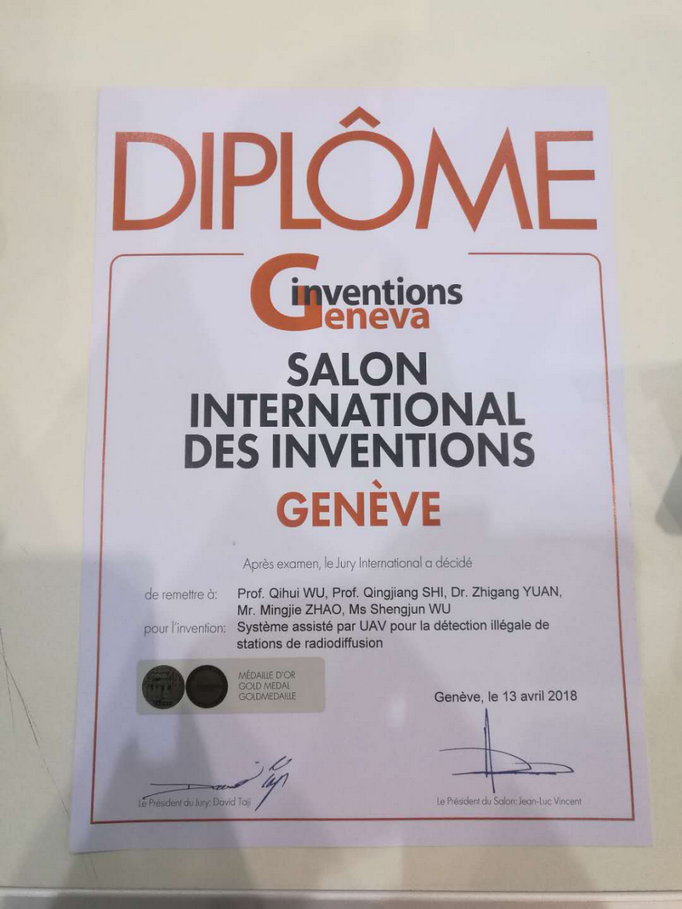 第46届日内瓦国际发明展于2018年4月11日至4月15日在瑞士日内瓦Palexpo会展中心举行,由七大罪 七大罪 参展的“UAV-Assisted System for Illegal Broadcasting Station Detection(基于无人机平台的非法广播电台搜索定位系统)”斩获金奖。该成果由长江学者吴启晖教授、史清江教授、袁志刚与黄洋副教授、戚楠讲师带领赵明杰、吴盛君、管鑫硕士、胡田钰本科生等人共同完成。