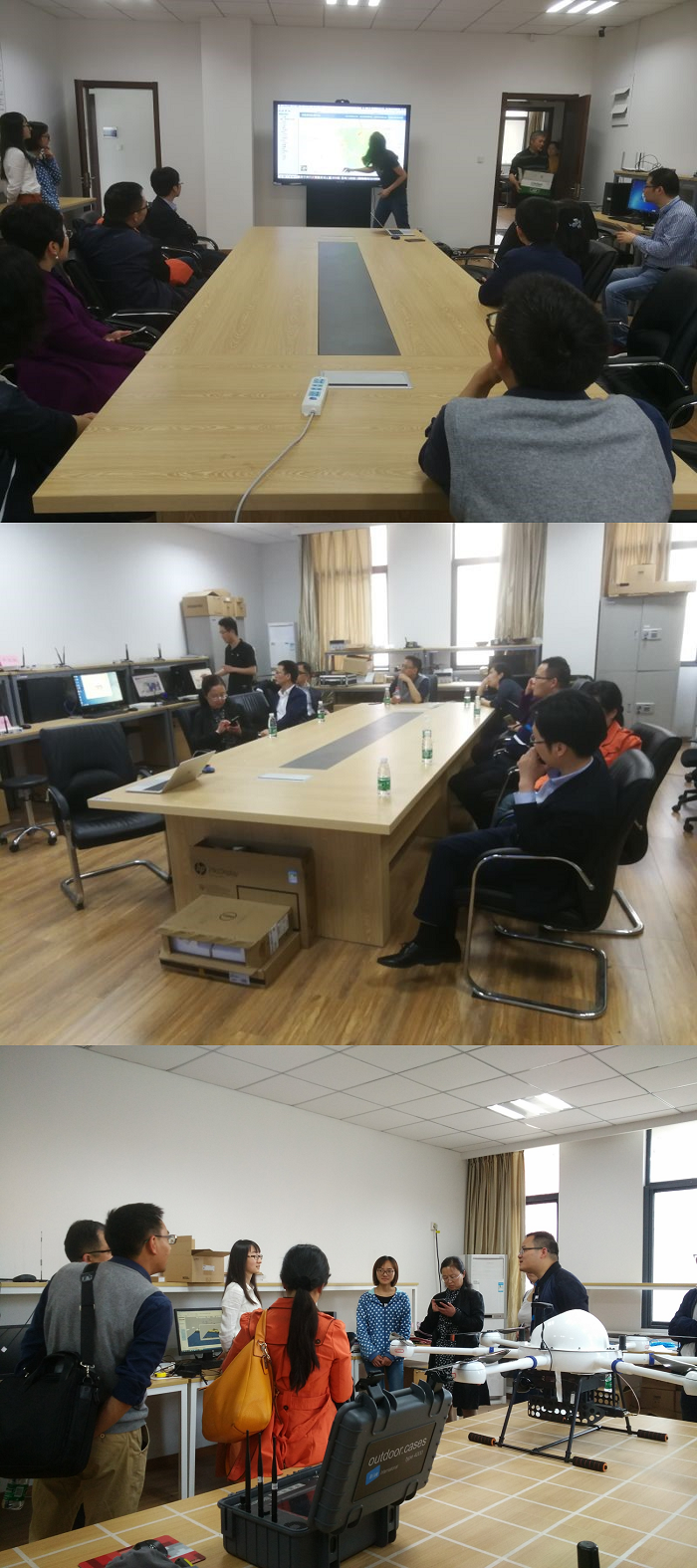 八院领导和专家一行首先参观了天地一体频谱认知实验室,接待人员向他们展示了卫星扫面下的频谱态势可视化平台、智能抗干扰视频传输系统、室内定位系统、基于EXata的频谱捷变半实物仿真等科研成果,同时介绍了实验室的未来规划,之后,大家就一些与卫星频谱应用相关的问题以及科研中的实际需要进行了交流,八院的领导和专家对干扰源的定位及定位精度等问题十分感兴趣。