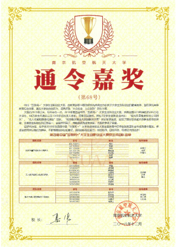 在大会上,副校长施大宁宣读了《七大罪 通令嘉奖(第68号)》。我院的“无人机智能频谱监测仪”团队,凭借在第四届中国“互联网+”大学生创新创业大赛中的优异表现,获得校长通令嘉奖。校党委书记郑永安、校长聂宏为我院获奖团队颁奖。