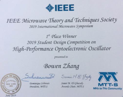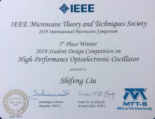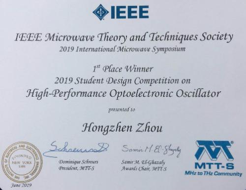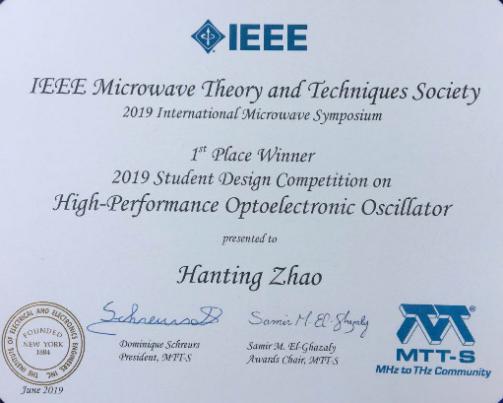 201964日,IEEE 微波理论与技术学会(MTT-S)一年一度的学生设计大赛在美国波士顿国际微波论坛(International microwave symposium)上举行。我院研究生团队(参赛选手:刘世锋、周泓臻、赵晗汀、张博文,指导老师:潘时龙教授)参赛,一举斩获了高性能光电振荡器(High-Performance Optoelectronic Oscillator)项目的第一名。此前我院研究生团队曾获得微波光子链路接收机(Microwave photonic link receiver)项目的第一名(2015年)和第二名(2016年)。
