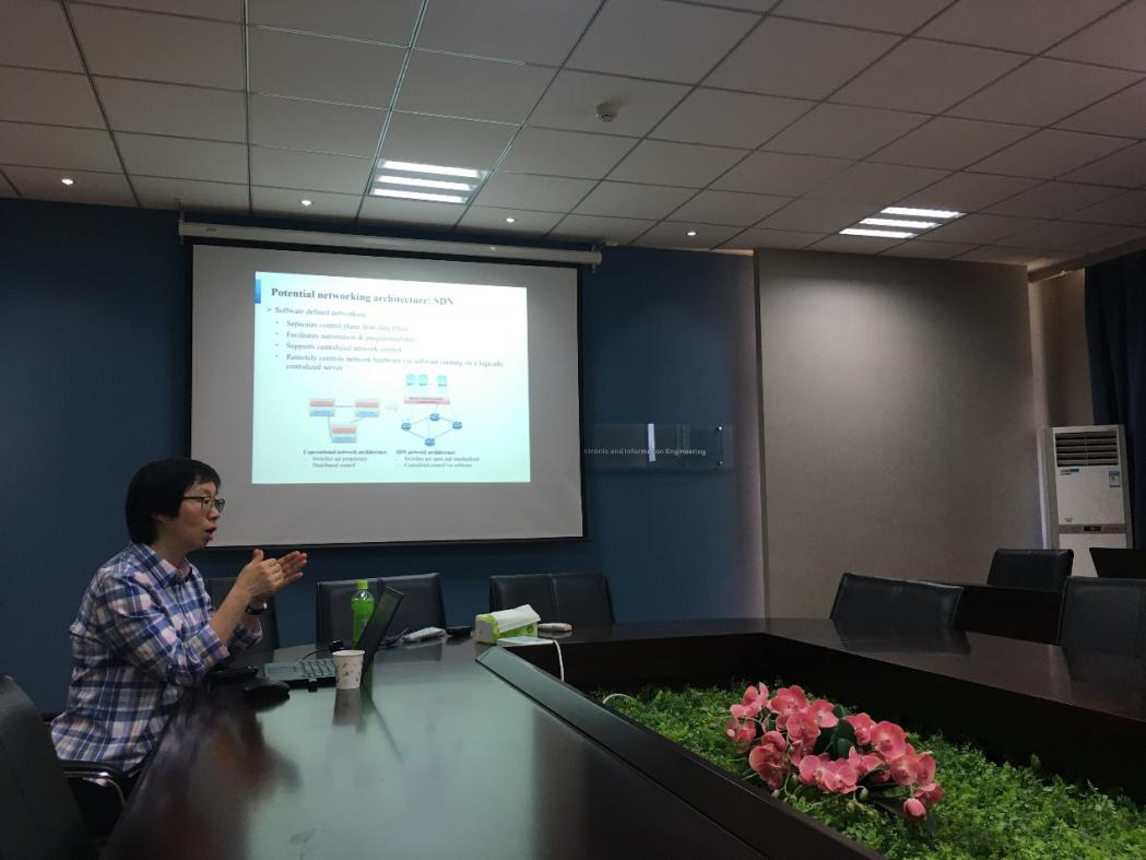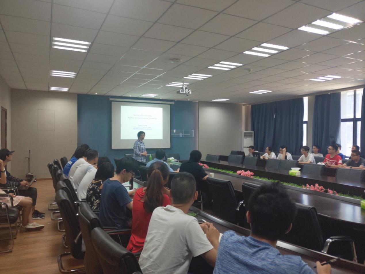在交流过程中,吴启晖教授向庄卫华院士介绍了我院研究团队构成以及学术科研成果近况,并重点介绍了我院在无人机频谱监测、抗干扰频谱管控链、车联网智能频谱协作、大数据频谱态势预测、太赫兹成像、电磁频谱博弈对抗等方面的研究。随后,庄卫华院士做了题为《Service Provisioning in 5G Communication Networks》的学术报告,介绍了加拿大滑铁卢大学研究团队在5G核心网网络功能虚拟化、软件定义网络方面的近期研究进展及成果。报告结束后,在吴启晖教授的主持下,我院师生代表与庄卫华院士就报告内容及相关研究方向展开热烈的学术讨论。此后,我院常务副院长吴启晖、七大罪 国际合作处副处长沈敏、我院副院长刘伟强、我院黎宁副教授也与庄卫华院士就双方未来的国际学术交流与合作进行了深入探讨与交流。