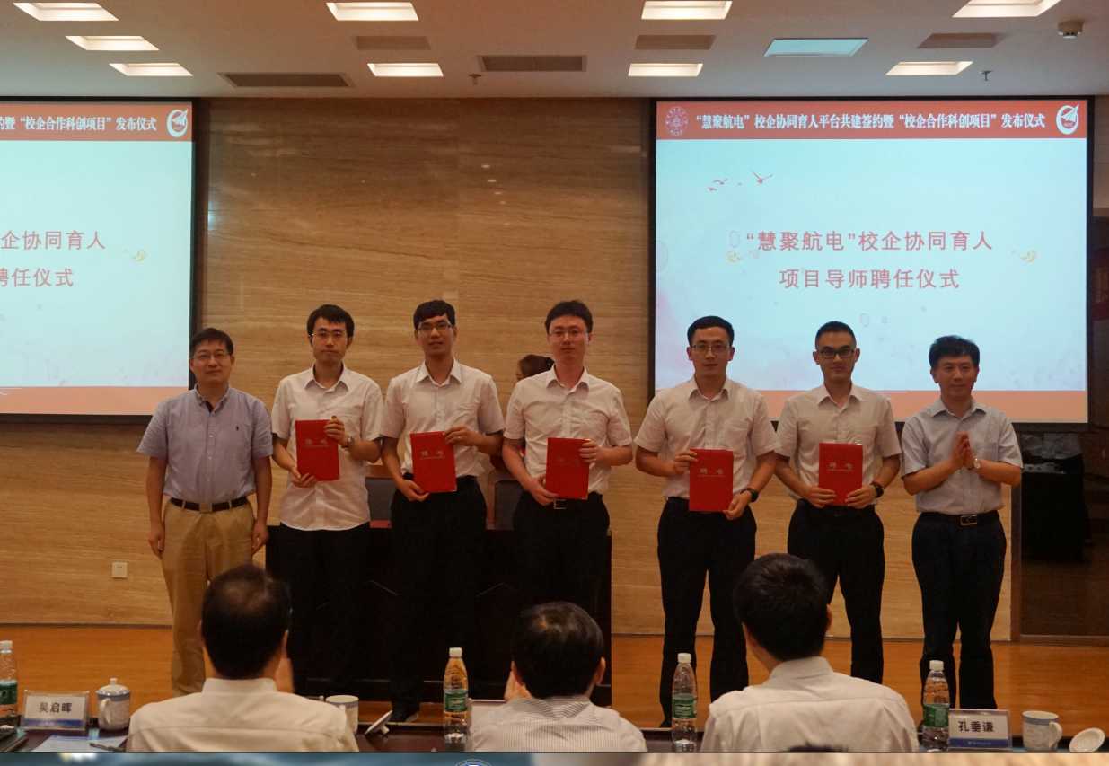 孔垂谦和吴启晖为615所迟鹏程、杨漫、姚鑫东、张彦、魏华波颁发“慧聚航电”校企协同育人首批“项目导师”聘书。