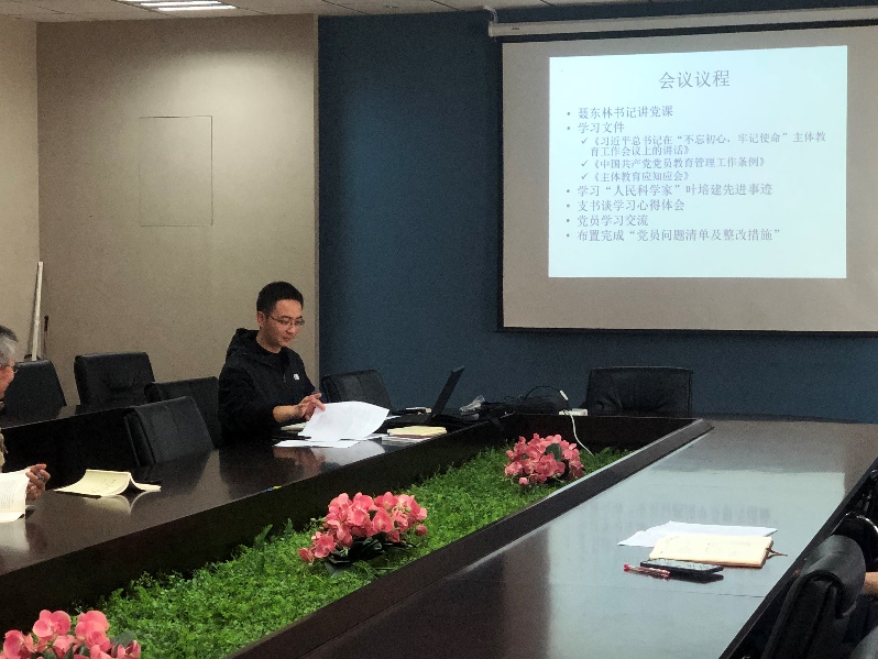 接着,支部副书记柳涛领学了《习近平总书记在“不忘初心,牢记使命”主题教育工作会议上的讲话》;宣读了《中国共产党党员教育管理工作条例》中党员日常教育管理方式,带领大家从组织制度上更为了解如何提高自己的组织纪律行;分享了自己学习《习近平关于“不忘初心,牢记使命”论述摘编》的心得体会,以“学高为师,德高为范”为标准,做品行之师、学问之师,做“四有”教师,指引学生知行合一,映照出学生成才之路。本次主题教育还根据学校党委下发《关于向“人民科学家”叶培建同志学习的决定》,对叶培建的先进事迹进行学习。会上指出要学习叶培建同志对党忠诚、坚守信仰的政治品格。革命理想高于天。要学习叶培建同志胸怀祖国、情系航天的爱国情怀。同为航天科研工作者中的一名,我们要发扬叶培建精神,在科研上能做到唯实创新、攻坚克难。同时,要学习叶培建同志淡泊名利、潜心育人的师德风范。作为教育工作者要能深入课堂、实验室、学生宿舍一线。也能带领学生和青年教师对学科建设、教学科研、专业设置、人才培养、重点实验室建设等进行深入探讨。