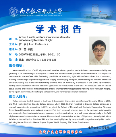 2020年8月26日,应学院李茁教授邀请,新加坡南洋理工大学及新加坡国立大学的四位知名教授将带来四场有关光学超材料和表面等离激元前沿理论及应用的精彩报告。以下为系列报告的报告主题和专家相关信息,报告以线上直播为主。