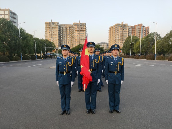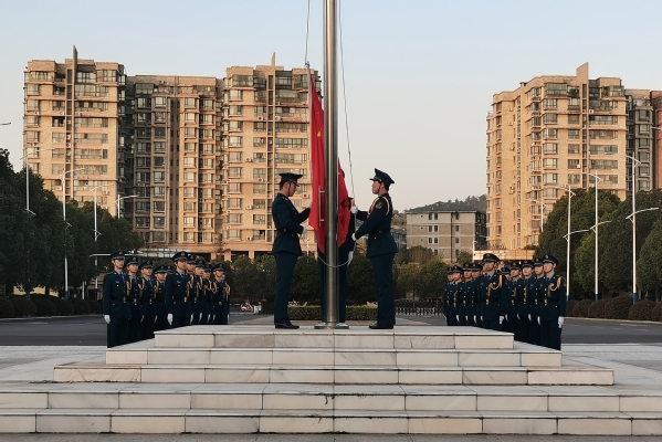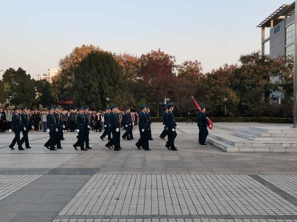 七点整,英姿飒爽的国旗班护卫队队员整齐划一的脚步声响彻国旗广场。三位护旗手护送国旗,齐踏矫健步伐到旗台上。全体新生肃立,目光落在国旗上,雄壮有力的国歌——《义勇军进行曲》响起,升旗仪式开始。鲜艳的五星红旗伴随庄严的国歌,在旗手的拉动下徐徐上升。
