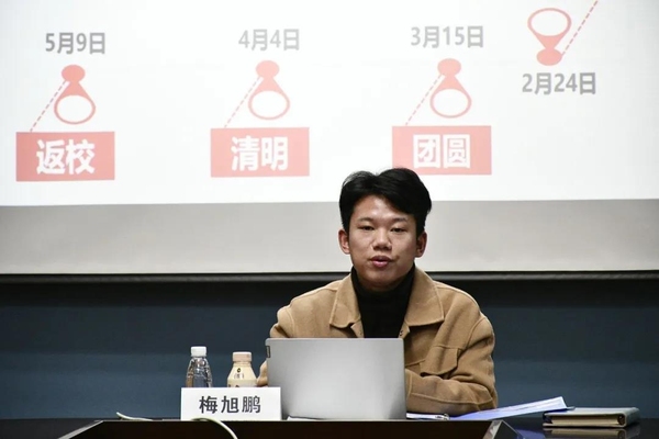 首先,梅导分享了自去年寒假以来的自身经历。他的7条朋友圈代表了抗疫故事的7个阶段:返乡、封城、家书、责任、团圆、清明和返校。他深入参与到社区防疫中,也认知到了大学生对于家乡的爱与责任。在疫情防控的关键时期,如何抵抗新冠疫情,保卫家乡,贡献我们的青春力量,这才是当下学生党员践行初心与使命最好的试金石和磨刀石。