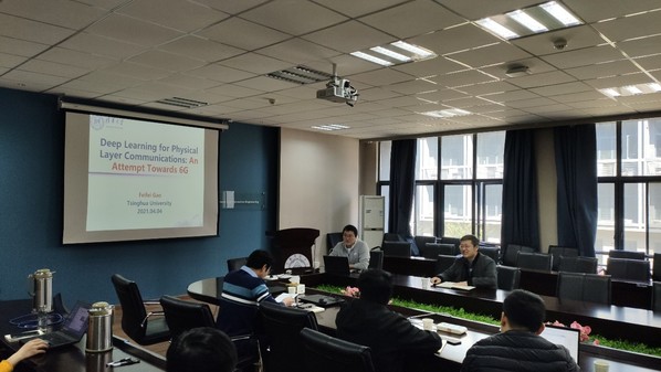 2021年4月4日上午,应我院天地一体频谱认知智能实验室周福辉教授邀请,清华大学高飞飞副教授莅临实验室访问交流,并做题为“基于深度学习的物理层通信:迈向6G的尝试”的学术报告。校长助理、我院常务副院长吴启晖教授也一同参与交流和指导,课题组王威研究员、黄洋副教授、孙萌副教授、董培浩副研究员和戚楠博士等参与交流。