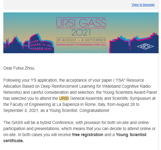 近日,我院周福辉教授以论文《基于深度强化学习的宽带认知无线电网络资源分配》入选国际无线电科学联盟(URSI GASS)青年科学家奖。该奖项是国际无线电科学界评选青年科技人才的传统奖项,每三年评选一次,奖励在无线电科学领域有突出贡献的青年研究人员,享有较高的国际知名度。