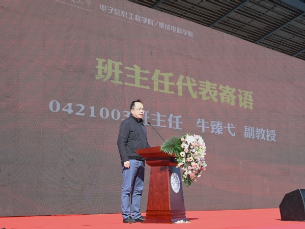 牛臻弋副教授作为班主任代表发言,并对新生提出了三点建议:第一,不忘初心,坚定梦想;第二,自律自强,团结互助;第三,勤于思考,勇于实践。并希望同学们在未来的学习生活里能够用心、细心、耐心,从容面对大学生活,追寻心中的梦想,创造精彩的人生,早日成为祖国空天科技与电子信息领域的栋梁!