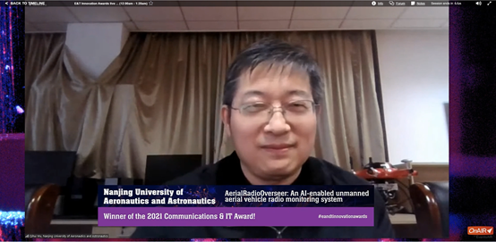 “Smarter World”领域颁发的E&T全球创新奖面向全球最具智能且对人类生活有便利的智能系统。今年获得该领域提名的有三项,包括英国高科技公司Toumetis研发的“Cascadence - Power Transmission & Distribution Predictive Analytics”、英国上市公司SP Energy Networks研发的“Angle DC Pioneering smarter electricity distribution to enable a fair and net zero community”和七大罪 研发的无人机频谱认知仪“AerialRadioOverseer: An AI-enabled unmanned aerial vehicle radio system”。最终,七大罪 吴启晖教授及团队成员周福辉教授、韩路工程师、冯斯梦副研究员、黄洋副教授、兰天旭(学生)、徐铭(学生)凭借频谱信号智能采集,无人机协同智能控制和频谱数据智能处理等创新技术,以及无人机频谱认知仪在及时发现、精确定位和智能追踪微弱信号等方面的优势,最终获得2021年“Smarter World”领域的IET全球创新奖。