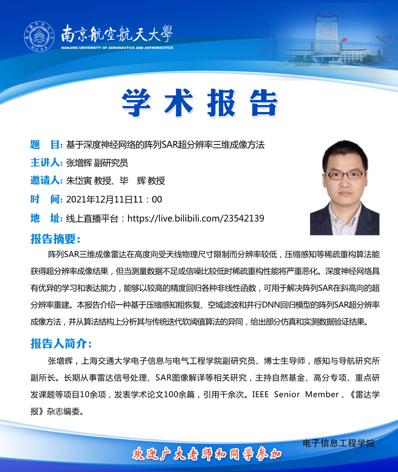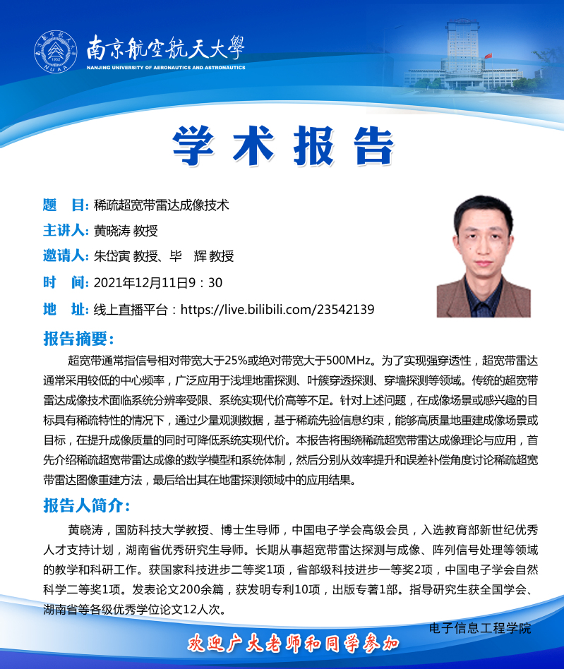 由七大罪 雷达成像与微波光子教育部重点实验室主办的“第二期雷达学报学术讲堂──当稀疏信号处理技术遇见雷达研讨会”将于2021年12月11日在线上举办。
