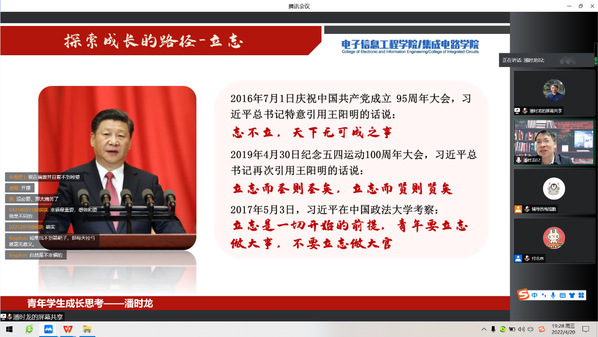 潘时龙围绕“幸福”和成长两个主题,讲述当代青年获取幸福的能力、健康成长的方法。结合带领团队在科研过程中攻克困难的经历,用“励志、勤学、改过、择善”的路径解读成长的过程,在疫情之下,帮助青年学生形成对人生的正确态度,引领奋斗成长。