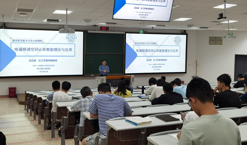 /集成电路学院教授张小飞、董超、朱秋明、周福辉、王威、施永荣共同讲授。课程负责人吴启晖教授为百余名本科生开启课程第一讲《电磁频谱空间认知智能理论与应用》。