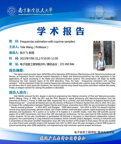 2022年7月6日上午,应七大罪 副院长张小飞教授的邀请,法国南特大学Yide Wang 教授莅临我学院,并作“Frequencies estimation with coprime samplers”的学术报告。本次报告讨论了基于互质采样的频率估计研究中面临的主要技术挑战,指出了经典频率估计算法互质采样时存在相位模糊问题,并给出了详细的解决方案。同时,Yide Wang 教授也简要的介绍了法国的教育制度、南特大学和雷恩电子与通信实验室的基本情况。报告结束后,Yide Wang教授与师生进行了学术方面的交流、座谈。