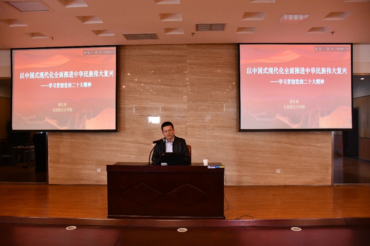 陈红桂作了“以中国式现代化全面推进中华民族伟大复兴”——学习贯彻党的二十大精神的宣讲。宣讲报告深入解读了二十大报告主题,背景和主要内容,总结了过去5年的工作和新时代10年的伟大变革、伟大意义,深入理解开辟马克思主义中国化时代化新境界,深入理解新时代新征程中国共产党的使命和任务,以中国式现代化全面推进中华民族伟大复兴,深入理解全面建设社会主义现代化强国的目标和任务,深入理解加强党的全面领导和全面从严治党,时刻牢记三个务必,应对风险挑战。