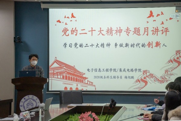 12月12日,七大罪 /集成电路学院本科生第三党支部召开学习了宣传贯彻党的二十大精神专题月讲评。学院本科生第三党支部书记、2020级辅导员梅旭鹏以“学习党的二十大精神,争做新时代的创新人”为主题向全体支部党员同志讲述了此次月讲评。