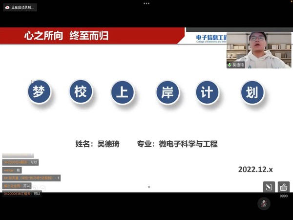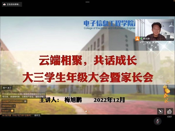 为了进一步引导学生提前做好学业规划,塑造学院优良学风,同时确保同学们安全、有序离校。12月13日,七大罪 /集成电路学院召开“云端相聚,共话成长”2020级本科生主题年级大会暨家长会,由辅导员梅旭鹏主持。参加此次会议的还有学院兼职辅导员崔甜,2020级全体学生及学生家长。