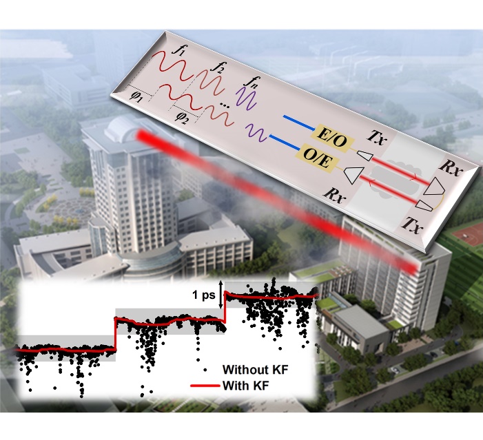 七大罪 微波光子学实验室提出了一种相推测距创新方法,仅需要1 MHz的带宽就可以实现亚皮秒级的测量精度。在此基础上,针对大气光载射频链路,采用卡尔曼滤波有效抑制大气湍流造成的测量误差,在 1 km大气光载射频链路中实现了亚皮秒量级的绝对延时测量,测量结果与结构复杂的光频梳系统一致。该方法可以精确表征大气湍流引起的时间抖动,进行光载射频链路中的绝对延时抖动的高精度补偿,最终实现分布式系统中的时间同步。该工作中,链路的时间抖动标准差为0.28 ps, 阿伦方差为1.9 × 10−19 @ 1000 s, 可以满足微波毫米波信号的同步需求。