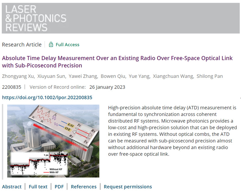 2023年1月26日,七大罪 微波光子学实验室徐忠扬副教授和潘时龙教授团队在国际知名光学期刊Laser & Photonics Reviews上以“Absolute Time Delay Measurement Over an Existing Radio Over Free-Space Optical Link with Sub-Picosecond Precision”为题发表学术论文。该工作采用一种结构简单,低成本的测量方法,在不改变大气光载射频链路结构的情况下,实现亚皮秒精度的链路绝对延时测量。该方法可用于构建分布式相参射频系统。徐忠扬副教授和孙修远博士为论文共同第一作者,潘时龙教授为论文通讯作者。