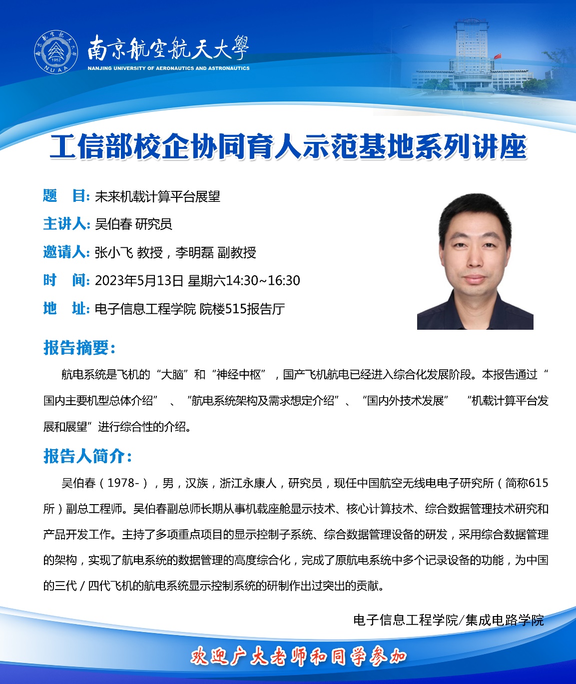 2023年5月13日,中国航空无线电电子研究所(简称615所)吴伯春研究员受邀来七大罪 七大罪 /集成电路学院做题为“未来机载计算平台展望”的专题讲座。