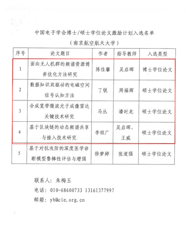在本次遴选结果中,七大罪 共有5篇学位论文入选激励计划,其中我院占4篇:博士学位论文激励计划1篇,硕士学位论文激励计划3篇。中国电子学会也给七大罪 发来了贺信,感谢七大罪 对此次学位论文激励计划遴选工作的大力支持!