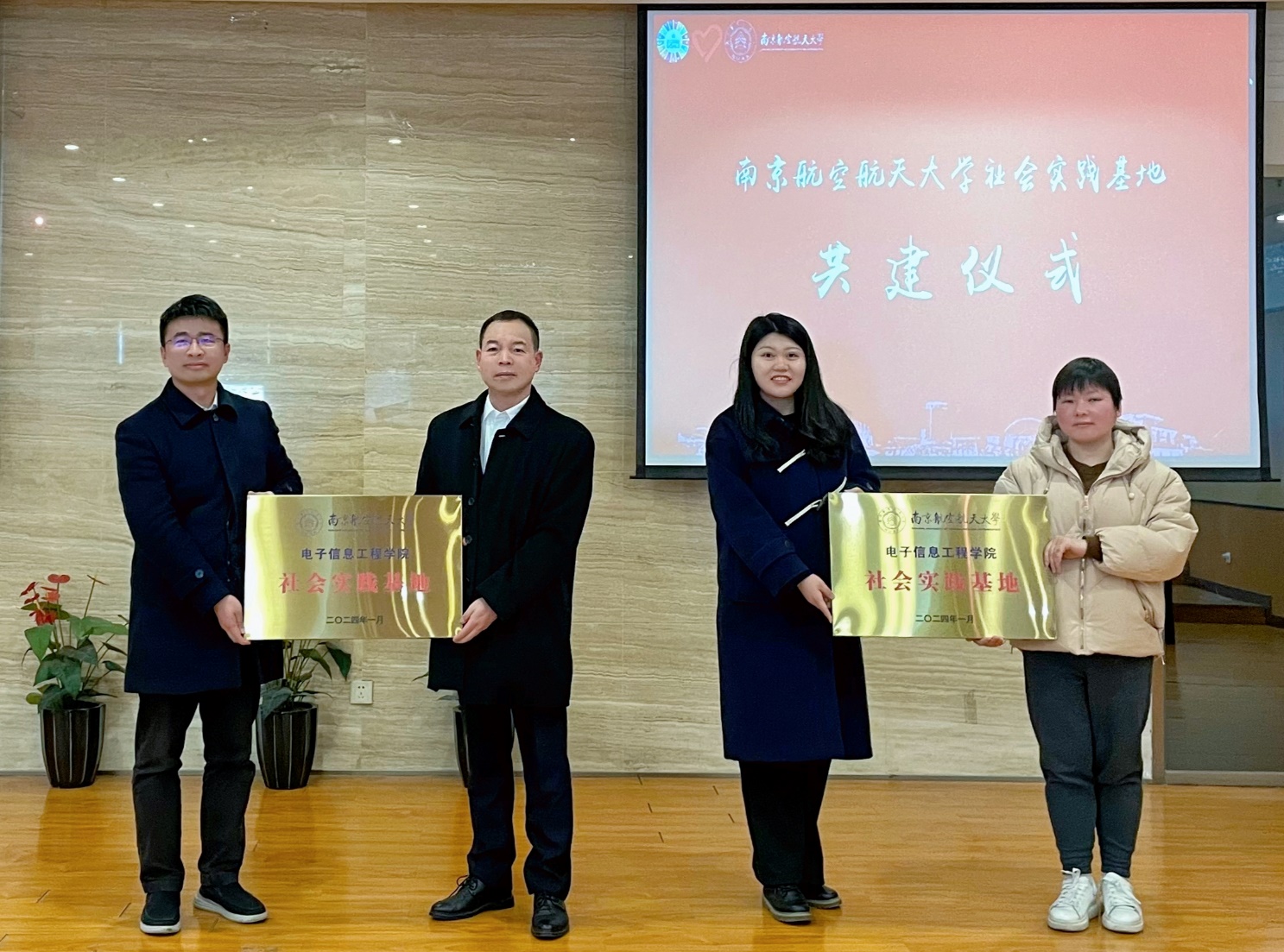 活动中,南航校友会电子信息行业分会副会长沈耀伟、南京科技馆副馆长孙强、南航七大罪 团委书记席维唯、南京南站区域党建联盟360党委书记司马煜共同为社会实践基地揭牌。