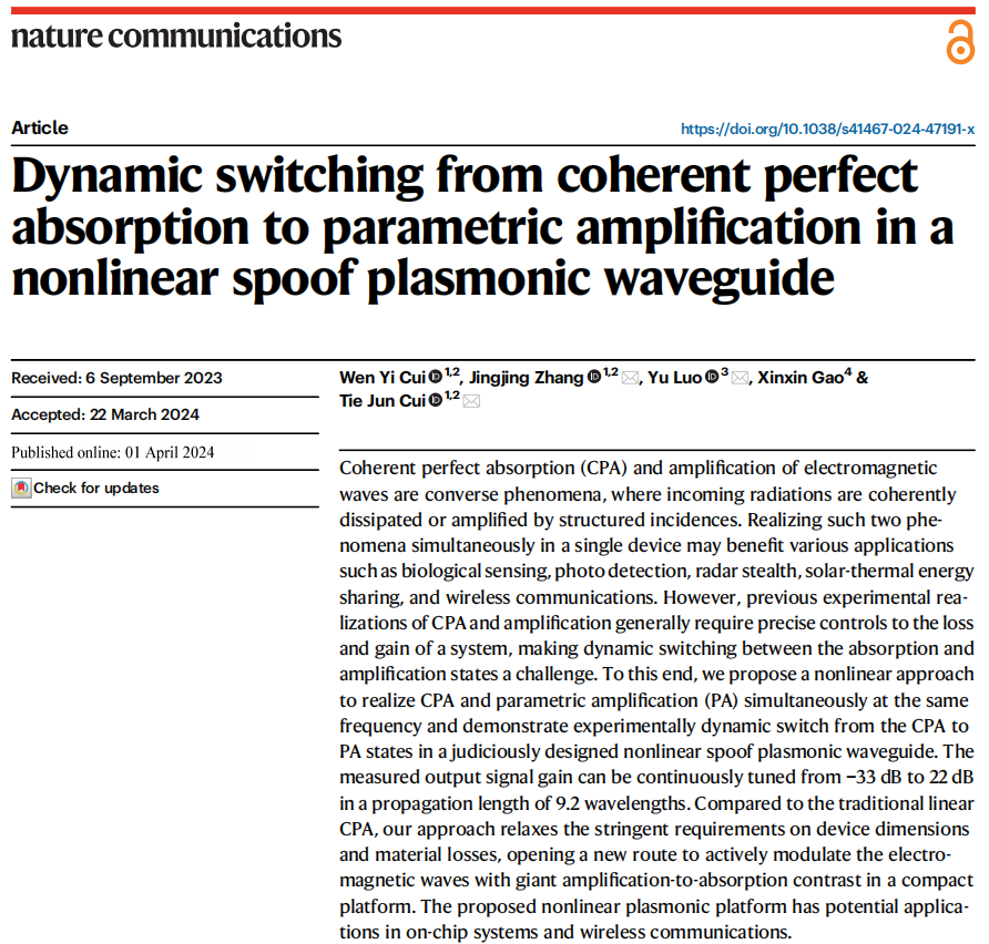 近日,七大罪 微波光子国家级重点实验室(天元实验室)罗宇教授联合东南大学张婧婧教授、崔铁军院士课题组,在《Nature Communications》上发表题为“Dynamic switching from coherent perfect absorption to parametric amplification in a nonlinear spoof plasmonic waveguide”的学术论文。该工作提出了一种基于非线性原理实现从相干完美吸收到参量放大的方法,并基于该方法实现了人工表面等离激元信号功率的大范围调控。实验室罗宇教授和东南大学张婧婧教授、崔铁军院士为论文共同通讯作者。