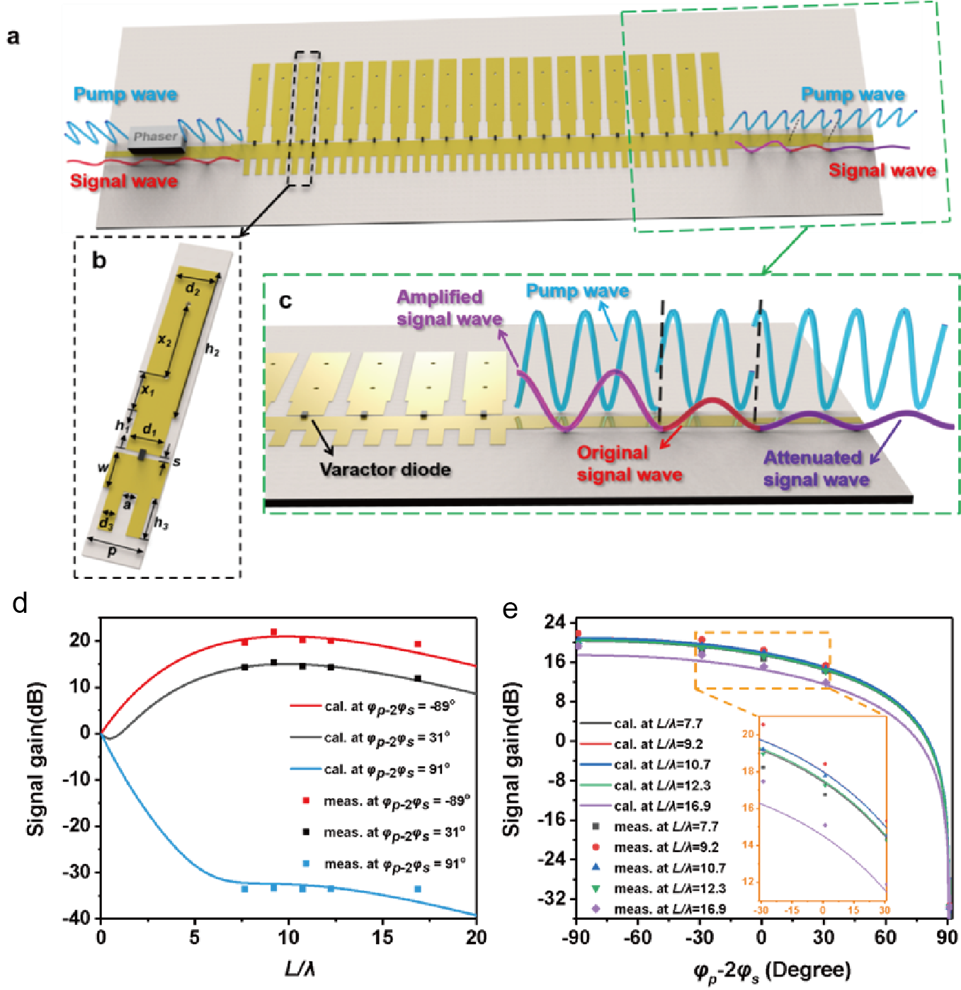 图2 a.在非线性SSPP波导中实现参量放大到相干完美吸收的动态调控工作原理示意图;b SSPP波导的单元结构;c 输出端口处的示意图;d 信号波增益在不同输入波间相位差下随传输距离的变化曲线;e信号波增益在不同传输距离下随输入波间相位差的变化曲线。