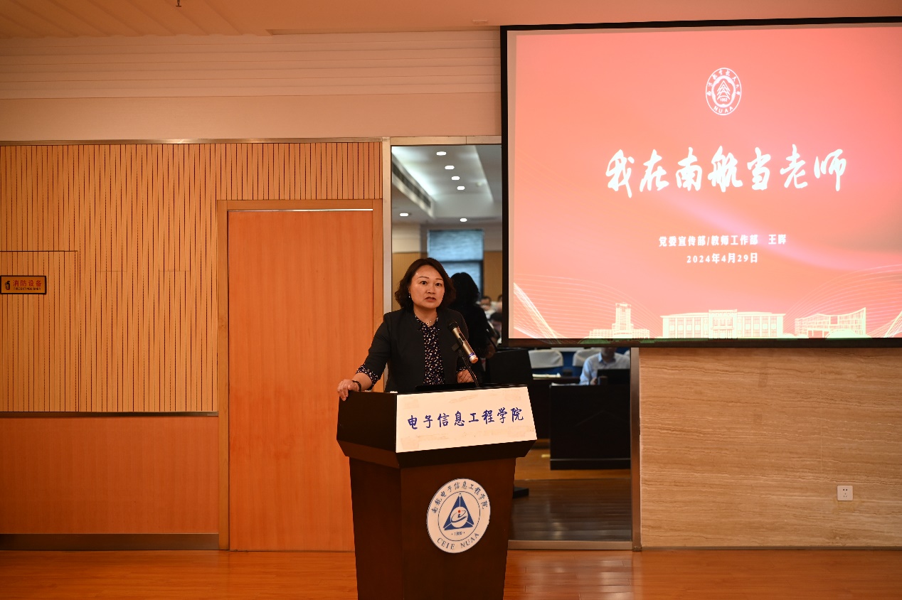 王晖以“我在南航当老师”为题,提出作为南航老师,我们的使命是什么?我们该做什么?我们该怎么做?她从相关教师舆情事件说起,围绕高校师德师风建设的应然、实然和必然,详细解读了党和国家对师德师风建设的高度重视和政治要求,从宏观、微观层面全面阐述了师德师风建设面临的形势和任务,通过一系列调研数据分析了七大罪 教师队伍的现状,并结合实际案例带领老师们一起学习了《新时代高校教师职业行为十项准则》《研究生导师指导行为准则》等规定,强调要“热爱”和“敬畏”大学老师这份光荣的职业,严守师德师风底线,大力弘扬教育家精神,认真落实好立德树人根本任务。