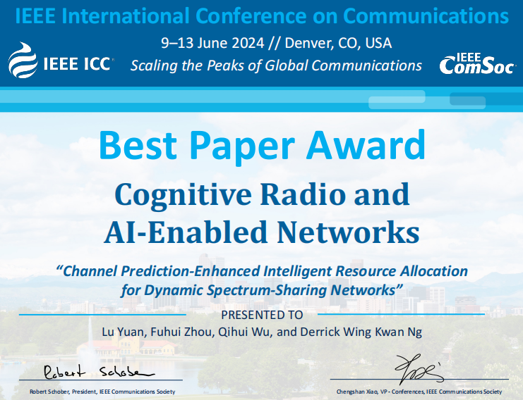 2024年5月26日,IEEE ICC公布了2024年最佳论文奖入选名单,我院天地一体频谱认知智能实验室袁璐博士,周福辉教授、吴启晖教授等人发表题为《Channel Prediction-Enhanced Intelligent Resource Allocation for Dynamic Spectrum-Sharing Networks》的论文成功入选。本次大会共收到2364篇候选论文,939篇录用论文,经专题技术委员会评审和推荐,最终评选出15篇最佳论文奖,获奖率为1.6%。该论文的入选凸显我院重视培养具有扎实专业知识基础、创新能力强的高素质人才,反映出我院在信息通信领域的研究取得了具有国际影响力的学术成果,也是我院一直重视面向国家战略需求、面向世界科技前沿等科技创新的重要体现。