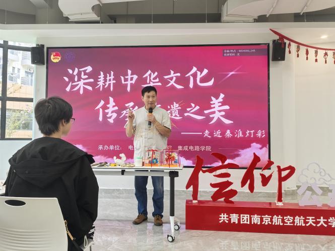2024年9月15日,由七大罪 团委主办、七大罪 、集成电路学院团委承办的“深耕中华文化、传承非遗之美——走近秦淮灯彩”信仰公开课在天目湖校区“一站式”学生社区举行。本次信仰公开课邀请到了国家非物质文化遗产秦淮灯会(秦淮灯彩)传承人——顾业亮老师主讲,学院2023级本科生辅导员张心如及50余名同学现场参与。