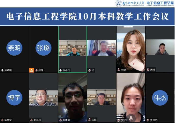 为有序推进本学期教学工作、加强规范化管理,10月7日,电子信息工程学院副院长张小飞带领本科教学工作团队开展教学工作阶段会议。院长助理夏伟杰,系教学副主任王毅、晋本周,专业执行负责人胡志忠、周博,实践教学中心副主任邱旦峰,教师代表华博宇,学院教学办参与此次会议。