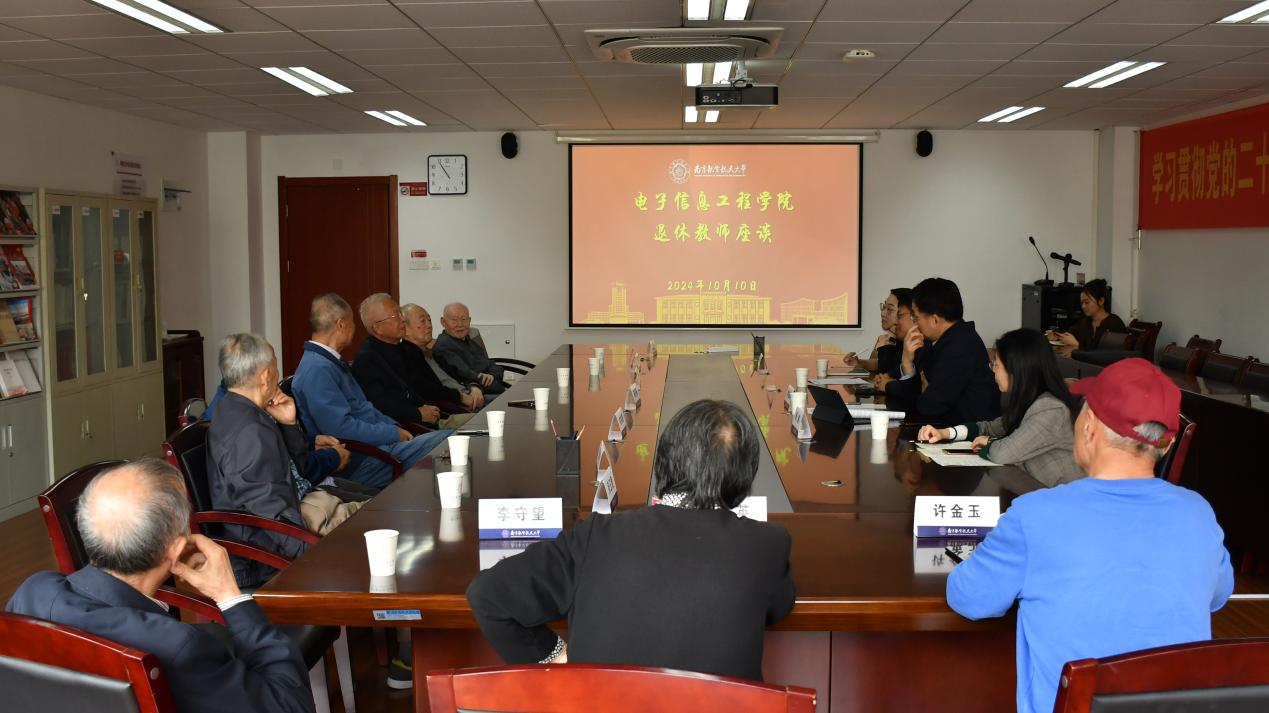 离退休教师座谈会在西苑南航职工活动中心312学院举行。党委书记季海群、常务副院长潘时龙、副书记王宇宁、副院长季娟及十余位离退休教师齐聚一堂,忆院史、庆重阳。学院党委书记季海群主持会议。
