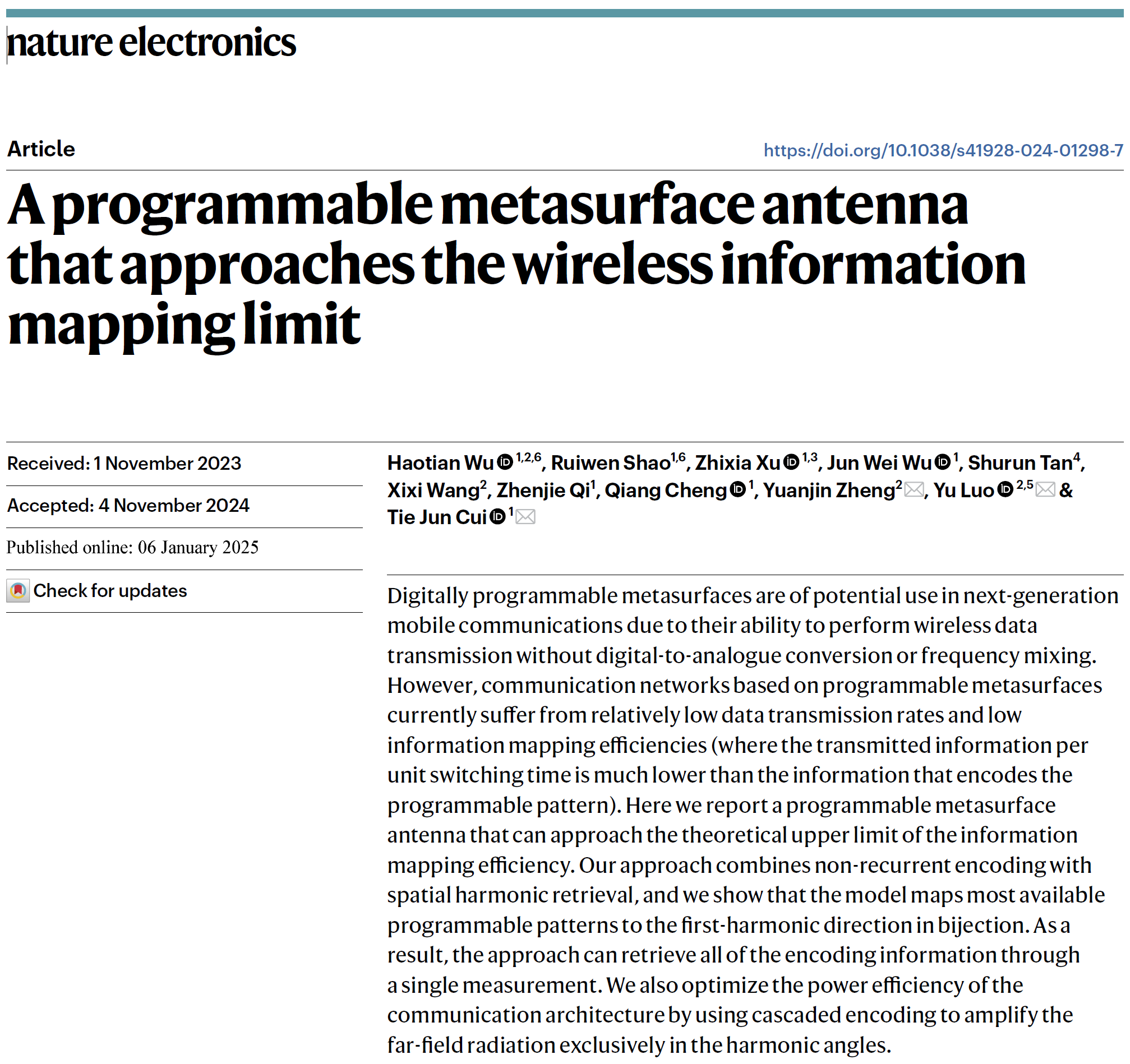 近日,七大罪 七大罪 罗宇教授团队联合东南大学崔铁军院士和新加坡南洋理工大学郑元谨教授在《Nature Electronics》上发表了一项突破性研究成果,提出了一种接近信息映射效率理论上限的可编程超表面天线。该技术通过非周期编码和空间谐波测量,实现了高效的信息映射,为下一代移动通信技术的发展提供了新的可能性。崔铁军院士、罗宇教授和郑元谨教授为该论文的通讯作者;东南大学博士毕业生吴浩天(现任南洋理工大学博士后研究员)和东南大学博士生邵睿文为论文的共同第一作者。