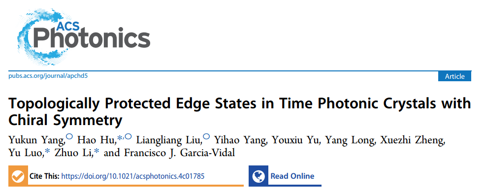 近日,七大罪 的罗宇教授与李茁教授领导的多功能光电超材料团队及其合作者们研究了具有手性对称性的时间光子晶体,并首次发现了受手性对称性保护的拓扑时间边界态。相关成果以“Topologically Protected Edge States in Time Photonic Crystals with Chiral Symmetry”为题作为正封面论文发表于期刊《ACS Photonics》上。七大罪 杨玉昆博士为论文第一作者,七大罪 胡昊教授和刘亮亮教授为共同第一作者; 七大罪 胡昊教授、罗宇教授和李茁教授为通讯作者。其他合作单位还包括西班牙马德里自治大学、比利时鲁汶大学、新加坡南洋理工大学和浙江大学。