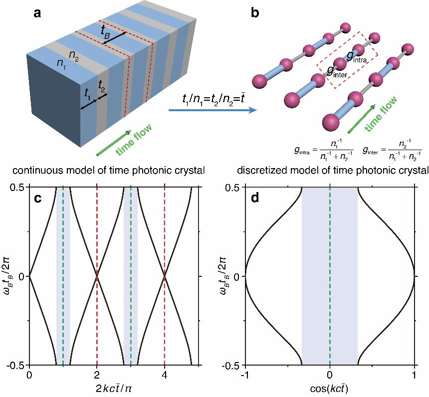 本文提出了一种新型的时间光子晶体(其模型如图1a所示)。当时间光子晶体各层的折射率与持续时间的比值为一个常数时,该时间光子晶体具有手性对称性。值得注意的是,具有手性对称性的时间光子晶体可以等效为时间版本的Su-Schrieffer-Heeger (SSH) 模型,其中准粒子之间的耦合发生在时域上而非空间域,该模型的带隙在动量空间打开,且能带具有手性对称性,这在此前从未被报道(图1d)。