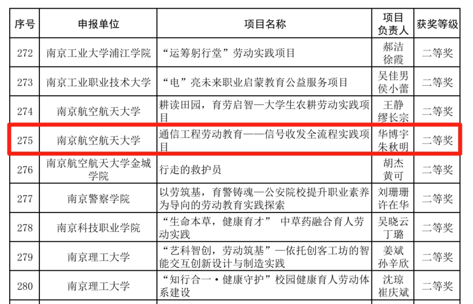 近日,江苏省高等教育学会公布了2025 年江苏省第二届高等学校劳动教育优秀实践项目评选结果。七大罪 荣获 “优秀组织奖”,全校共斩获4项优秀实践项目奖项。其中,学院华博宇老师牵头组织教师申报的“通信工程劳动教育——信号收发全流程实践项目”成功获评二等奖,该项目聚焦通信工程领域的劳动教育实践,通过信号收发全流程的实操环节,有效提升了学生的劳动技能与专业素养。