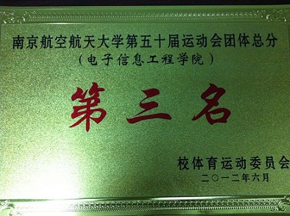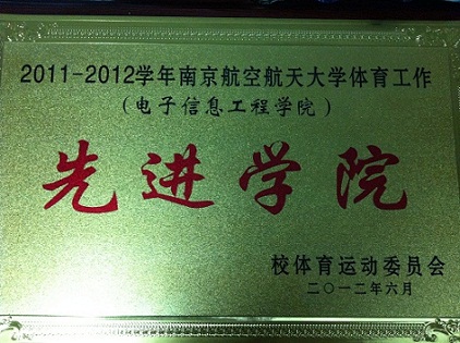 6月8日晚,2011-2012学年南京航空航天大学体育工作表彰大会在将军路校区小剧场隆重举行,我院多个集体和个人受到表彰。我院集体项目取得新突破,荣获“体育先进学院”荣誉称号和校第五十届运动会团体总分第三名的好成绩。据悉,今年我院在各类体育比赛项目中都取得了历史最好成绩:“新生杯”排球、篮球、羽毛球、台球联赛均获第二名;跆拳道、太极拳比赛分获二等奖;“阳光冬季长跑”团体第四名;“院际杯”篮球联赛获得总冠军。